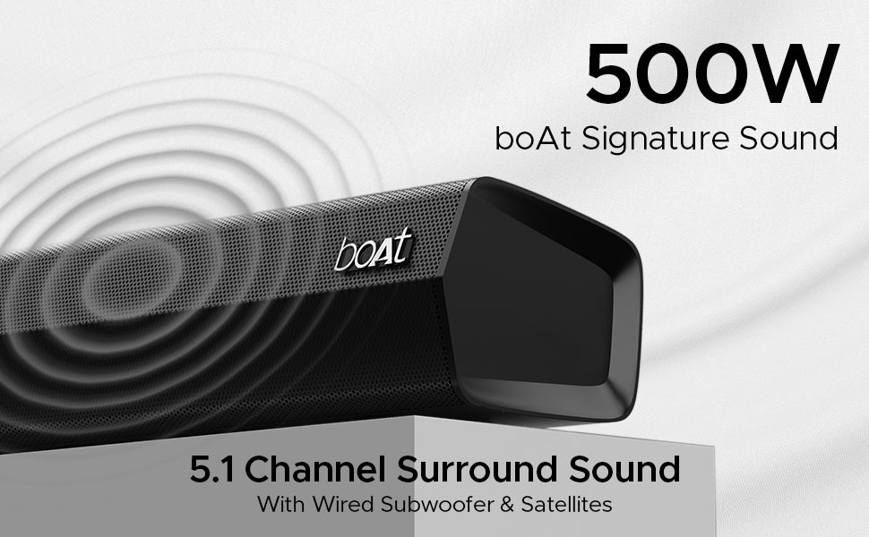 ఈ సౌండ్బార్ ప్రధాన ఆకర్షణ 500W RMS boAt Signature Sound. సాధారణ టీవీ లేదా చిన్న స్పీకర్లతో పోలిస్తే ఇది చాలా శక్తివంతంగా, స్పష్టంగా వినిపిస్తుంది. హాలీవుడ్ బ్లాక్బస్టర్స్, స్పోర్ట్స్ మ్యాచ్లు లేదా మ్యూజిక్ కాన్సర్ట్ అనుభవం – అన్నీ మీ ఇంట్లోనే రియల్ థియేటర్ ఫీలింగ్ ఇస్తాయి.